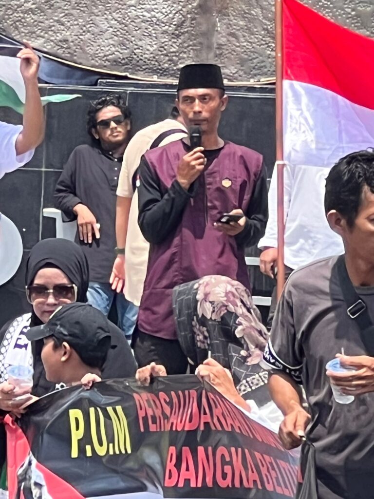 Dalam aksi tersebut, sejumlah tokoh dari Persaudaraan Umat Muslim Bangka Belitung menyampaikan orasi dukungan untuk Palestina. Di antaranya H. Andi, Ustadz Efendi Saputra, Rian Gunadi, Aurel, Saepudin, Hendra, Rully, serta banyak tokoh tokoh Perwakilan dari Persaudaraan unat muslim Babel yang secara bergantian menyerukan pentingnya kepedulian umat Islam terhadap penderitaan rakyat Palestina serta menjaga persatuan umat.